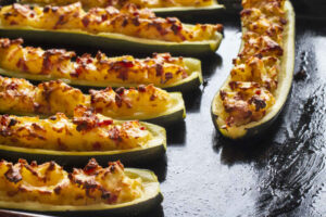 Then, spoon it into the zucchini boats and spread evenly. Finish off by topping with your cheese and bake for 30-40 minutes.