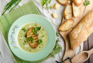 Creamy leek herby soup with toast, garlic and olive oil